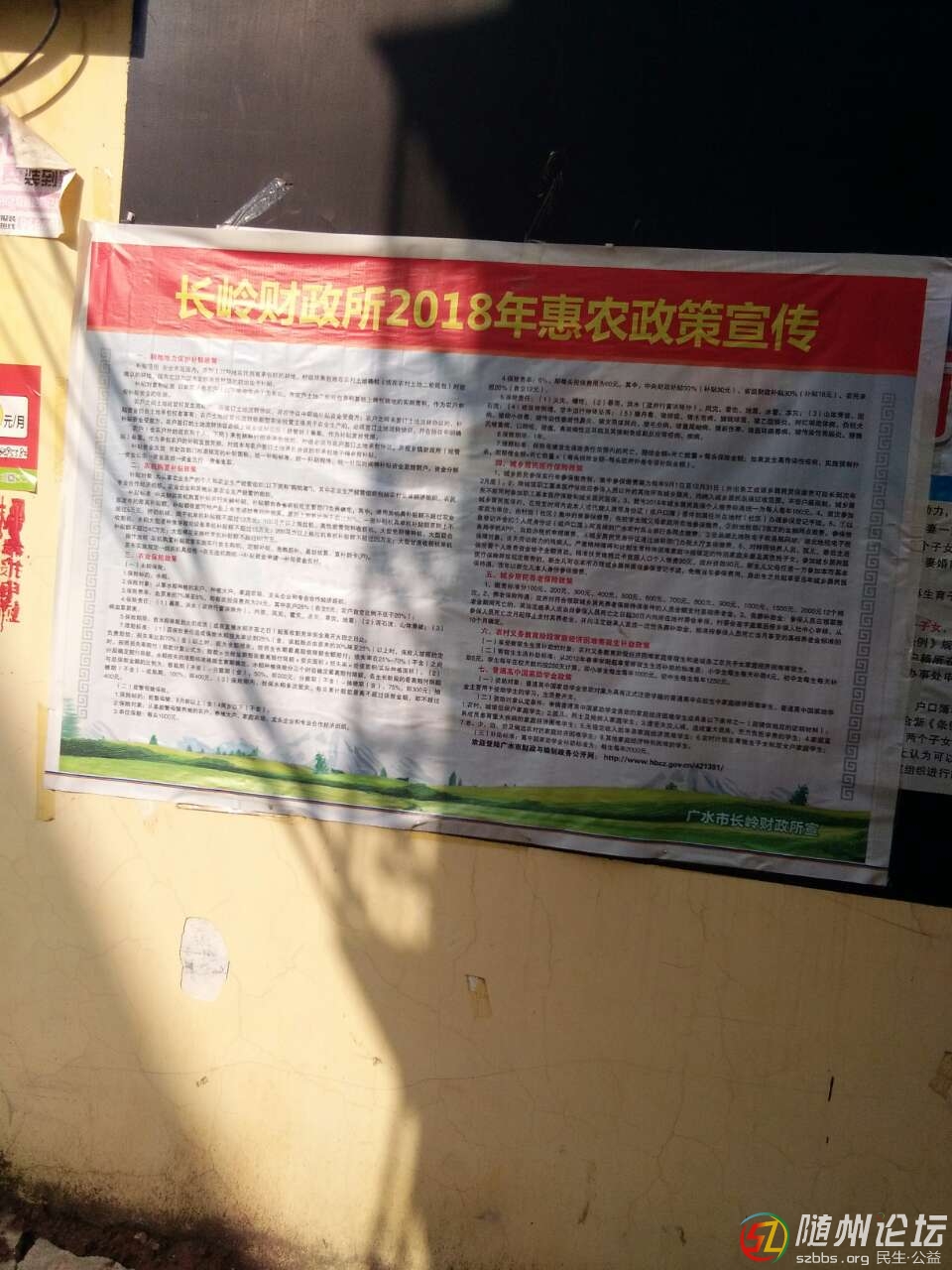 隨州論壇訊,東方紅報道,廣水市長嶺鎮(zhèn)積 極搞好國家惠農(nóng)政策宣傳。近日,在廣水市長嶺鎮(zhèn)平林市村宣傳墻上張貼著由長嶺財政所制作的今年惠農(nóng)政策宣傳情況(如圖),長嶺財政所主要從七個大的方面詳細介紹了國家的惠農(nóng) ...