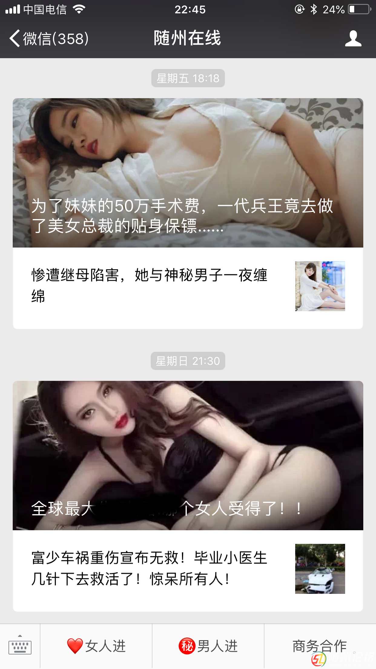 正文摘要:本帖最后由 寧寧 于 2018-8-23 15:14 編輯 去年,幾個好朋友、同學都微信給我發(fā)來一個微信公眾號,要我關(guān)注,看名字像是新聞網(wǎng)站,就關(guān)注了。沒想到老是推送一些跟隨州無關(guān)的新聞,這幾天還持續(xù)發(fā) ... |