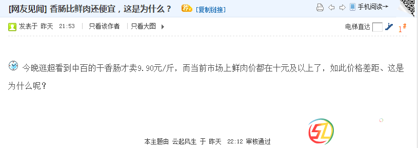 本帖最后由 楚隨人 于 2018-11-7 14:35 編輯 市場上的東西 太貴了、賣不動,便宜了、不放心,老百姓有很大的一個指望:就是請職能部門盡點(diǎn)心、才能讓消費(fèi)者省點(diǎn)心。 這不:網(wǎng)上有個帖子"干香腸比鮮 ...