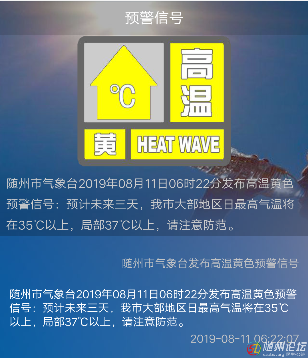 【預警發(fā)布中心】隨州市氣象臺2019年08月11日06時22分發(fā)布高溫黃色預警信號:預計未來三天,我市大部地區(qū)日最高氣溫將在35℃以上,局部37℃以上,請注意防范。 ...