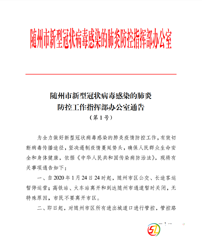 一、自2020年1月24日24時起市區(qū)公交和長途客運暫停運營,高鐵站、火車站隨州通道暫時關(guān)閉,對隨州市區(qū)所有進出城道口進行管控,管控路段涉及316國道240、國道346國道、262省道、263省道的 ...