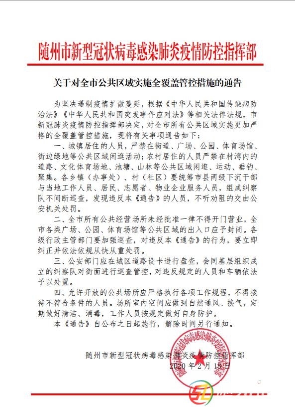 本帖最后由 隨州日報 于 2020-2-19 10:23 編輯 ) q$ F; Q7 s3 B7 t4 e6 |4 T- \. ` 關(guān)于對全市公共區(qū)域?qū)嵤┤采w管控措施的通告0 o2 l2 T% s* P# @. X6 \ 為堅(jiān)決遏制疫情擴(kuò)散蔓延,根據(jù)《中華人民 ...