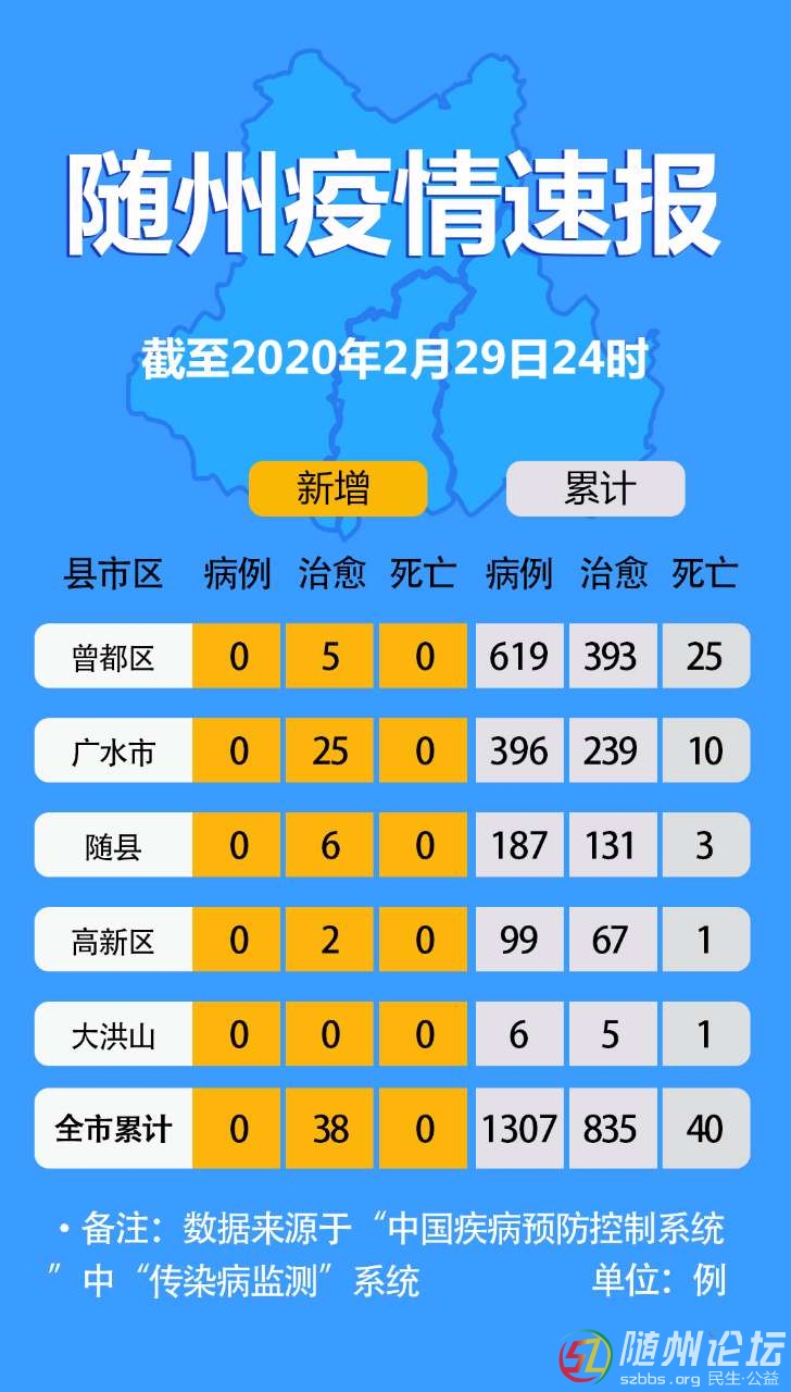 隨州疫情速報(bào)(截至2020年2月29日24時(shí))6 X3 T& v- a v P1 P& A$ z! c* D 7 ?7 c3 Z# v- l5 G
