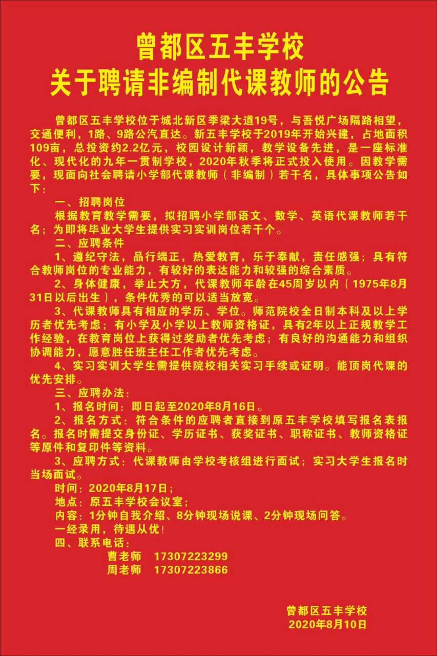 曾都區(qū)五豐學(xué)校聘請(qǐng)非編制代課老師的公告