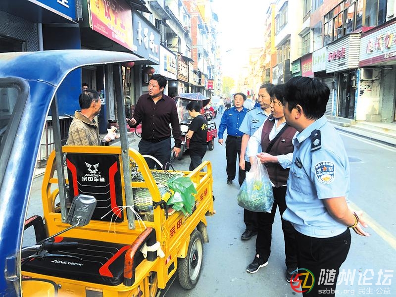 曾都區(qū)西城辦事處雙龍寺社區(qū)加強(qiáng)轄區(qū)背街小巷環(huán)境秩序整治,保持干凈整潔有序,助力文明城市建設(shè)。圖為巡邏專班對隨意賣菜的小販進(jìn)行勸導(dǎo)。(隨州日報(bào)通訊員冷紅娟攝) ...