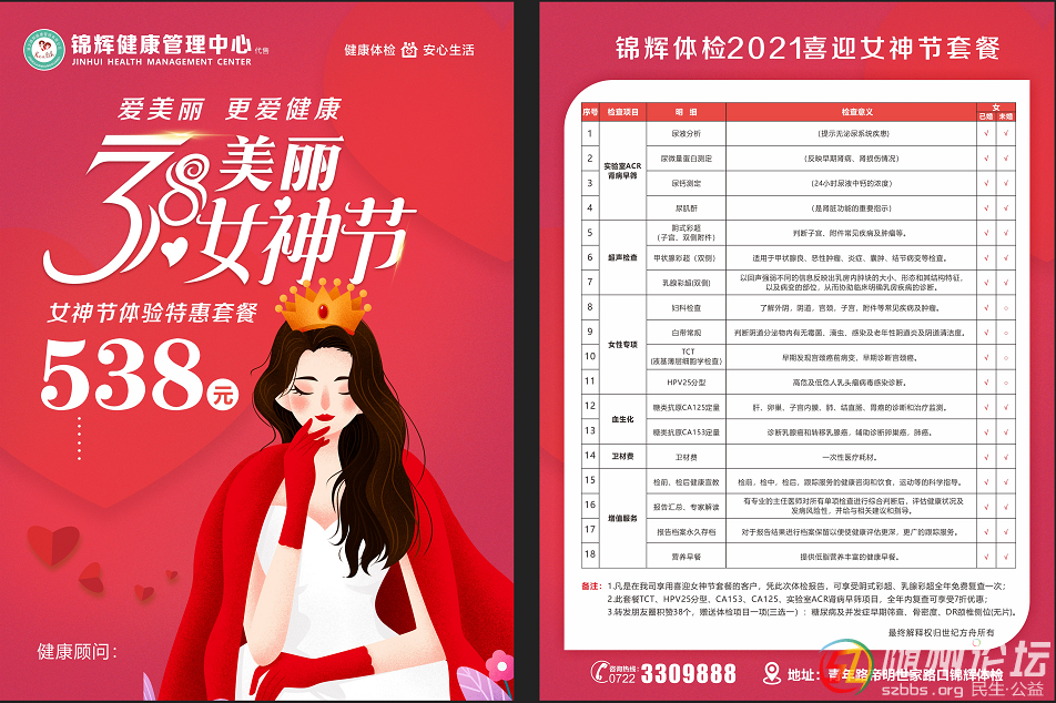 錦輝體檢三八女神節(jié)優(yōu)惠活動陽春三月,人面桃花相映紅;三八佳節(jié),巾幗美麗顯風(fēng)流!至此三八佳節(jié)到來之際,為了回饋全市廣大女性朋友對錦輝體檢的關(guān)懷和支持,值此佳節(jié)向廣大女性同胞送上節(jié)日的祝福,同時(shí)在節(jié)日期間 ...