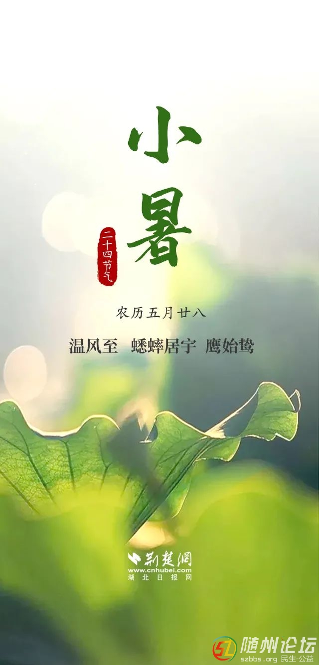 正文摘要:本帖最后由 隨州日?qǐng)?bào) 于 2021-7-6 14:58 編輯 來(lái)源:湖北日?qǐng)?bào) “倏忽溫風(fēng)至,因循小暑來(lái)?!薄吨袊?guó)天文年歷》顯示,北京時(shí)間7月7日5時(shí)5分將迎來(lái)“小暑”節(jié)氣,標(biāo)志我國(guó)大部分地區(qū)進(jìn)入炎熱季節(jié)。 來(lái)源:湖北日 ... |