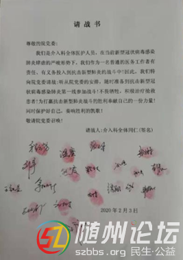 2020年2月3日,正月初十。介入醫(yī)學(xué)科醫(yī)護(hù)技全體人員主動(dòng)請戰(zhàn),向醫(yī)院遞交請戰(zhàn)書,爭上抗疫第一線,手術(shù)室護(hù)士長程云芳率先垂范,不顧足患未愈,帶頭在請戰(zhàn)書上第一個(gè)摁下紅手印。
